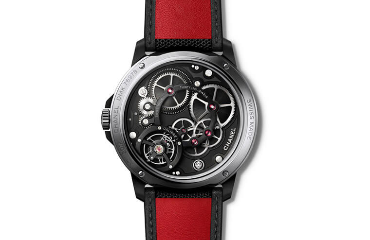 相较于面盘风格的大改造,底盖的Caliber 1机芯则是和先前推出的Monsieur都大同小异,不过由于机芯底板与夹板原本就有经过镀黑处理,置入运动感更强烈的外型设计中显得格外合拍,机芯精密的齿轮犹如一具动力磅礡的引擎,随时为Monsieur Superleggera提供强悍精准的走时能量。