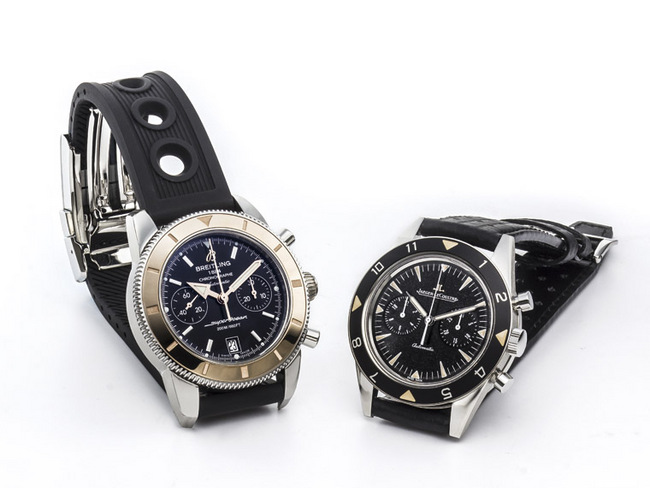▲ 左为BREITLING Superocean Heritage Chronographe 44mm,右为JAEGER- LECOULTRE TRE Deep Sea Vintage Chronograph。