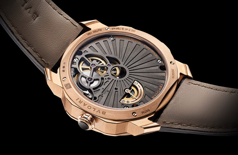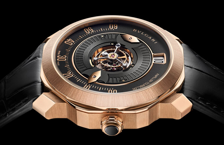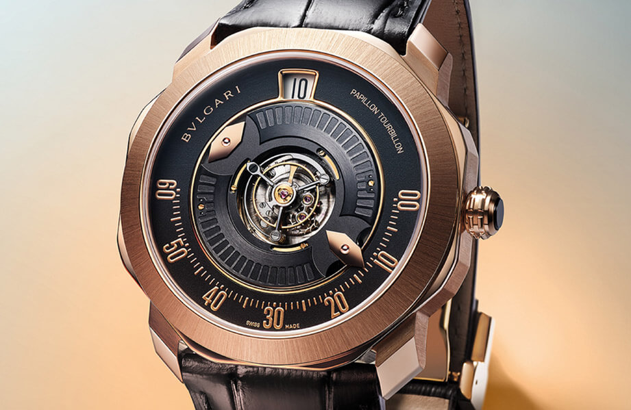 ▲宝格丽Octo Roma系列新增採用Papillon专利系统显时的陀飞轮手表,其有别于一般指针显时的巧思赋予手表强烈个性。
