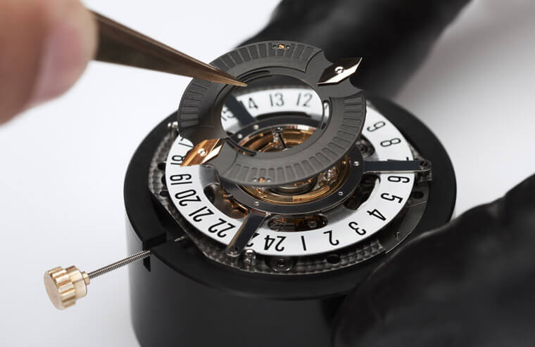 除了独特的分钟显示与跳时窗之外,品牌还将深受市场喜爱的复杂功能——陀飞轮与专利设计相结合。新款 Octo Roma Central Tourbillon Papillon採用中置陀飞轮,如此其便不会与横亙在面盘下半部的分钟刻度轨道重叠。至于跳时视窗设计蕴含陶瓷滚珠轴承,每经过1小时会配合蝴蝶指针走完60分钟而瞬间跳转至下一个小时数字。