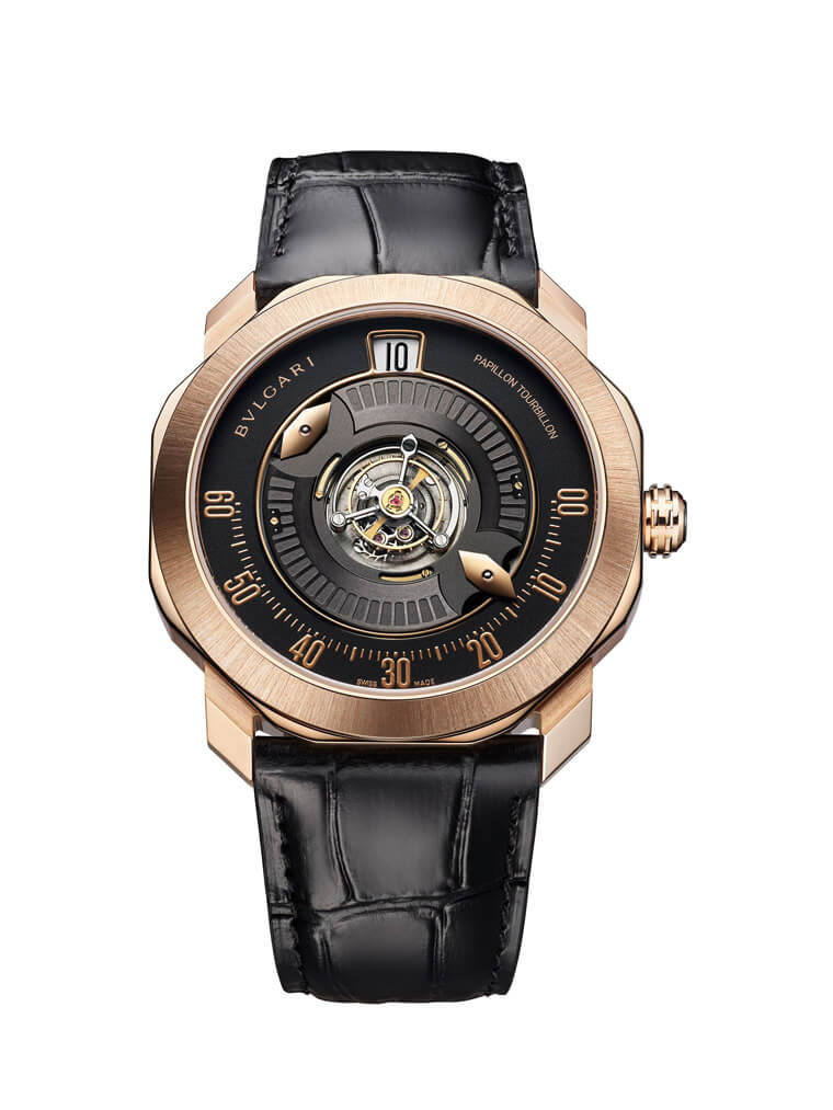 BVLGARI宝格丽新作Octo Roma Tourbillon Central Papillon蝴蝶中置陀飞轮以特殊设计的时与分显示,创造出令人耳目一新的阅时效果。