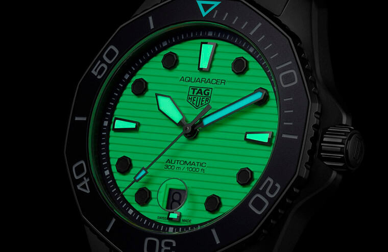 品牌为了确保手表能黑暗中清晰读时,Aquaracer Night Diver夜潜者手表的分针及中央秒针均覆以蓝色夜光涂料,与绿色面盘形成鲜明对比,至于时针及3、6、9、12点方向的八角形时标则是覆上绿色萤光涂料。位于单向旋转表圈12点方向的三角形设计,由于对安全精准测量下潜时间至关重要,所以这裡同样覆上蓝色夜光涂料,与分针及中央秒针相呼应,佩戴者也能够一眼清楚了解潜水时间。