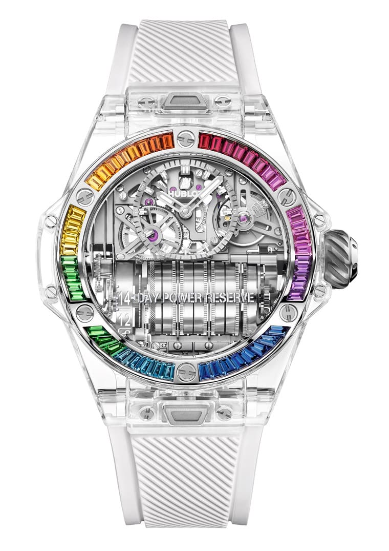 蓝宝石水晶材质/HUB9011手动上链机芯/偏心时、偏心分显示/14日动力储存显示/表圈镶彩色宝石48颗/蓝宝石水晶镜面/防水30米/表径45mm/限量50只/参考价:NT$ 3,990,000