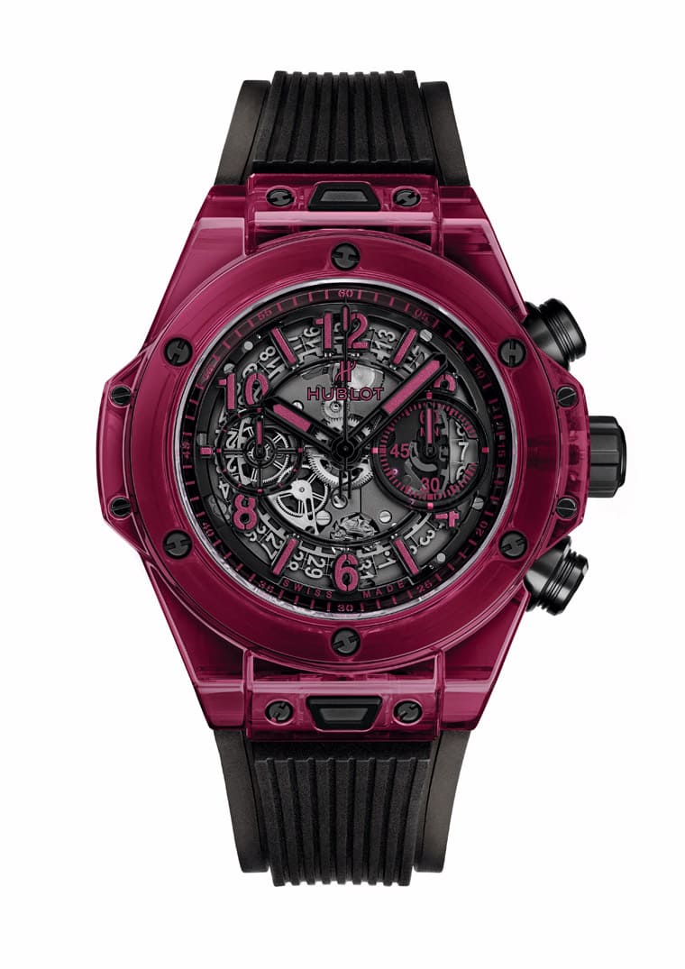 红色蓝宝石水晶材质/HUB1280 UNICO自动上链机芯/时、分、小秒、日期显示/计时码表功能/蓝宝石水晶镜面/防水100米/表径42mm/限量250只/参考价:NT$ 2,289,000
