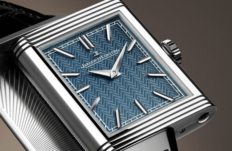 ▲库尔贝版本Reverso限量表面盘为蓝灰色大明火珐琅人字纹扭索饰纹。