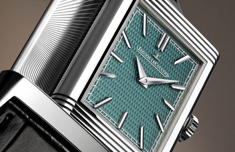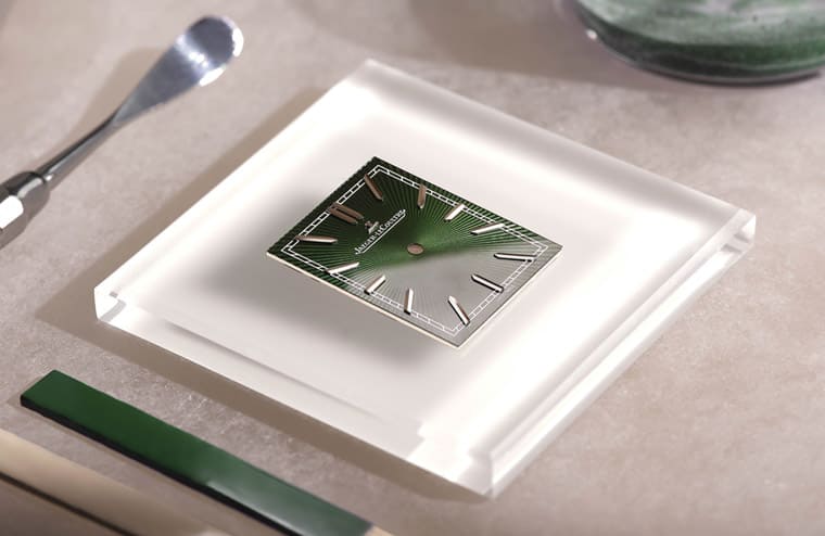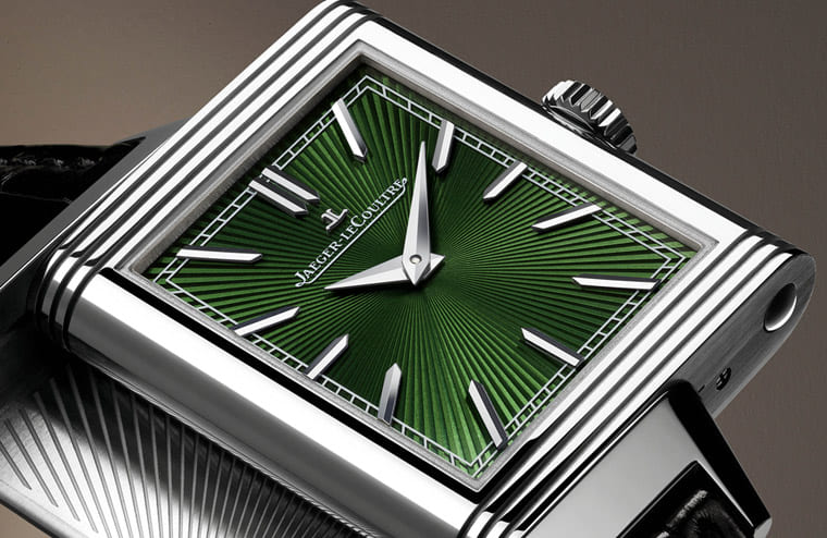 ▲梵谷版本Reverso限量表面盘为绿色大明火珐琅太阳放射状扭索饰纹。