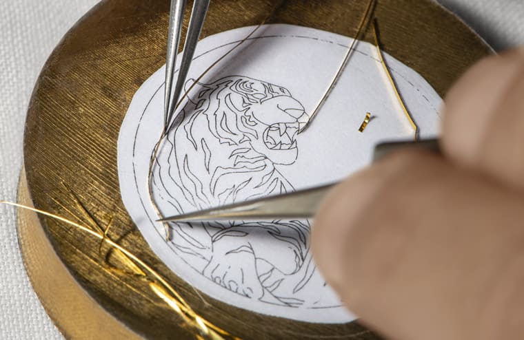 ▲Anita Porchet首先于面盘透过金线勾勒出老虎轮廓线条。
