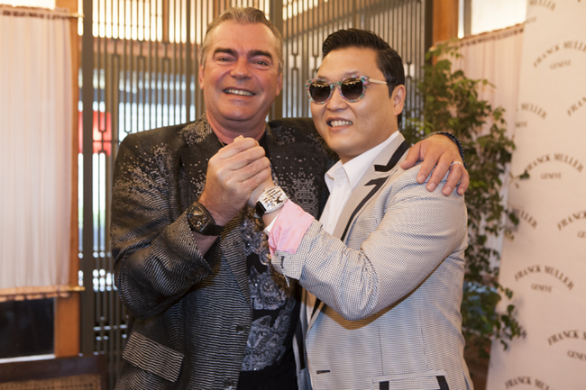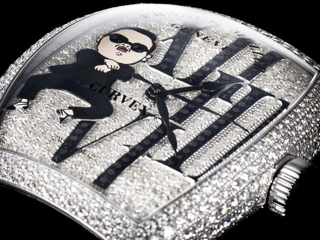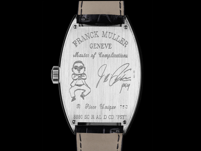今年,瑞士手表品牌FRANCK MULLER为表彰PSY的非凡成就,特别制作一枚独一无二的时计。设计採用品牌最具代表性的Cintrée Curvex酒桶形表壳,表盘有PSY的《江南Style》骑马舞姿漫画造型,并由Franck Muller先生在FRANCK MULLER亚洲区主席朱李月华博士及副主席朱俊浩先生陪同下亲自送赠予PSY。
