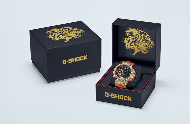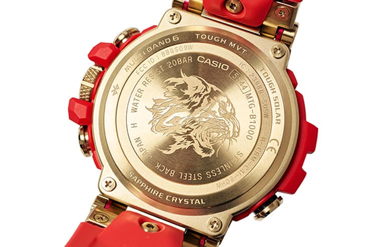 MTG-B1000CX採用金色表圈、背盖与红色表带,象徵农历新年的喜气氛围,并以红、金与黑三色加持未来新的一年运势高涨。其中金色表圈採用金色离子IP镀膜与雷射加工技术,刻划出深浅不一的虎纹效果,并将虎纹设计延伸进面盘裡,运用不同层次的黑色展现虎纹般的装饰效果,至于表眼、时标、指针、按把至扣环,则都採用红金两色交错,与手表整体的视觉效果互相呼应。而在手表底盖方面,G-SHOCK也精心刻上了「金虎头」的图样,画龙点睛地将虎年生肖主题诠释得淋漓尽致。