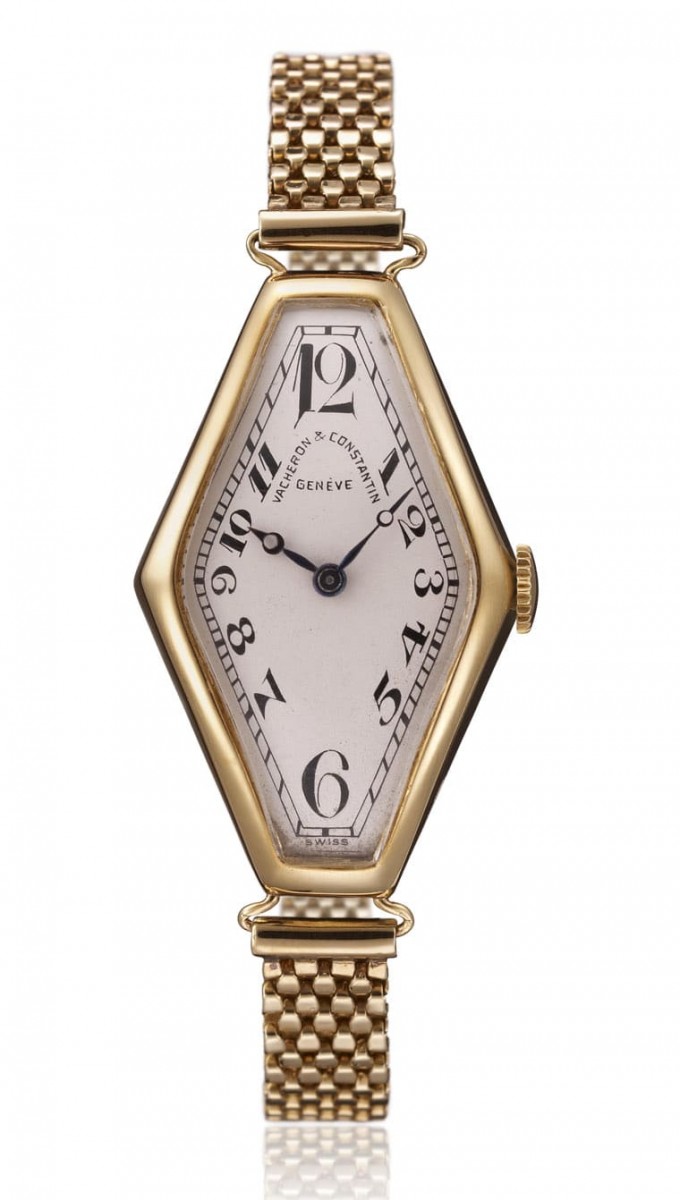 1910年代初期,江诗丹顿生产了所谓的「尖顶菱形」这种精致的手表造型。这款1919年的14K黄金腕表体现了此一创意;表款细粒质感的银色面盘装饰有配合表壳线条的黑色珐琅阿拉伯数字,而柔软的18K黄金链带更能服贴地包覆着手腕曲线。