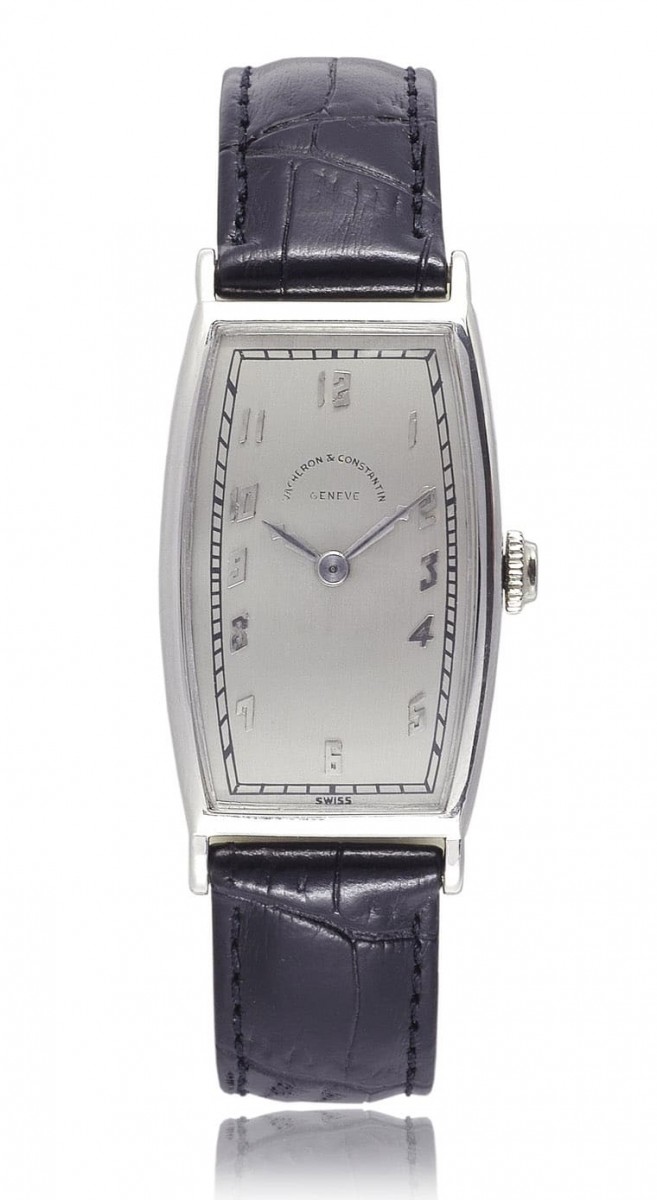 江诗丹顿在1916年左右研发出了一枚尺寸为6.5mm×26mm的矩形原型机芯,并于1923年发展至最终形态,这款1928年的18K白金弧形酒桶型手表就是搭载该枚机芯的代表作。表款底盖刻有江诗丹顿美国代理商的名 称”E.E. Robert New York”,展现同型表款对美国消费者的吸引力。