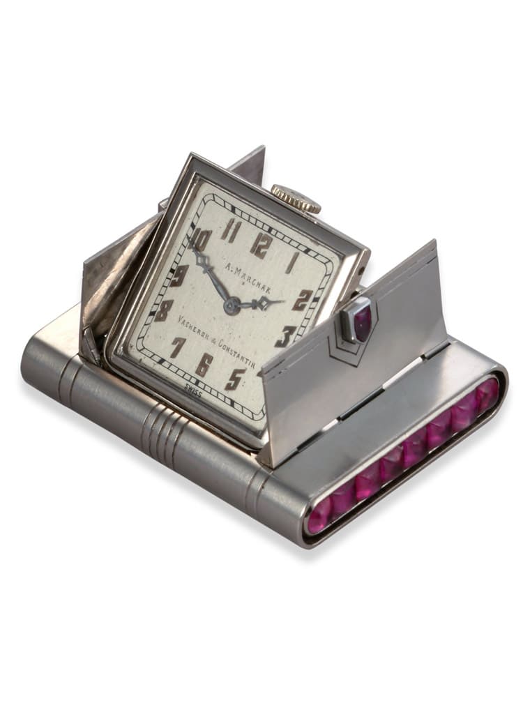 这只「手拿包」表款又被称作「惊喜表款」,机构的原理来自Verger Frères专利的开闭式表款。这只小巧的精品可以收进手提包中或是口袋裡,也可以摆在桌上当作桌钟,表款以白金制成,侧面镶有10颗球面切割的红宝石。