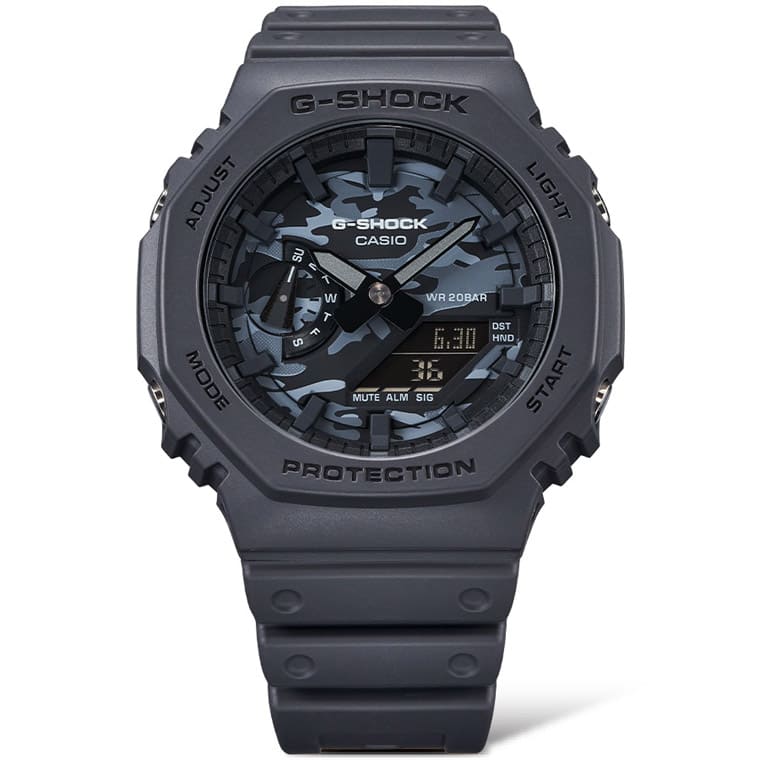 至于卡西欧的人气王——GA-2100农家橡树系列也有GA2100CA-8A做为代表,这款表换上了与黑色相近的深灰色表带和表壳,它招牌的特色包括八角形表圈和11.8mm纤薄表壳,它的表壳是内含碳纤维的高硬度精密树脂,既轻盈也坚固,而手表兼具指针和数位双显的设计,也是表迷之所以会爱上它的重要原因。