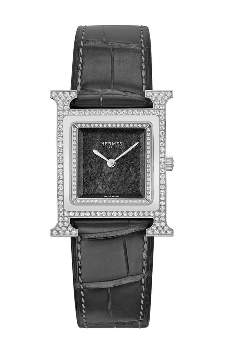 新推出的Heure H手表为爱马仕首度将彩色半宝石引进系列的新尝试,品牌分别採用不锈钢或玫瑰金材质制作手表表壳,并搭配不同顏色的鱷鱼皮表带先勾勒出三款表的个性。首先看到第一款为表壳镶嵌120颗钻石的中尺寸(26x26mm)不锈钢手表,面盘採用来自火山岩的稀有半宝石——银曜石,周围则另外镶嵌64颗钻石呼应表壳钻石光芒。第二只为镶嵌表壳124颗钻石的小尺寸(21x21mm)玫瑰金表壳款式,爱马仕採用孔雀石来当作面盘,如同一颗周围装饰着56颗钻石的精致深绿色宝石。最后是镶嵌124颗钻石的小尺寸不锈钢表壳款式,其搭配能让人想起星空画面的砂金石,同样周围镶嵌56颗钻石锦上添花。