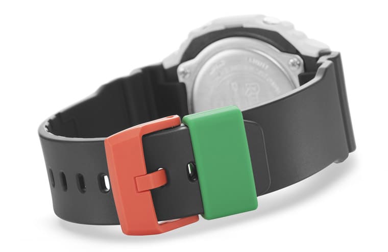 G-SHOCK将农家橡树的面盘当做画布,以黄、蓝、红三色勾勒出富有立体感的面盘图案,其上具有的黑色线条强化了这种平面立体感效果,同时面盘左色的星期指针也涂上蓝色与该处面盘色块达成视觉上的统一感。至于表扣与表带环部分也分别採用红、绿配色,同时表带与底盖处也都印有Rubik’s公司Logo来彰显手表的联名主题。