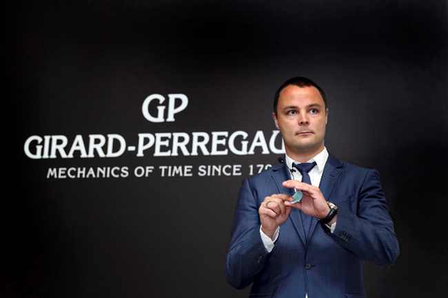 ▲ 芝柏表品牌机芯研发部门主管Stéphane Oes向中国媒体介绍GP芝柏表歷经八年心血精心研发的革命性理念——「恒定动力擒纵系统」