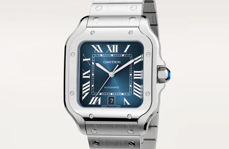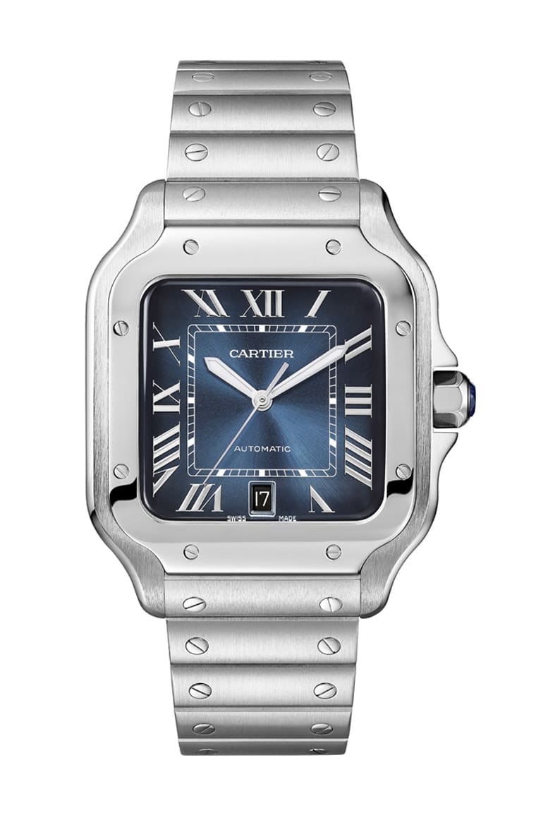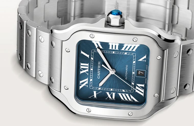 Santos原本是以白色面盘为主的作品,但是品牌在改款后的隔年推出了这款在系列中显得自成一格的蓝面大型款WSSA0030,使得想跳脱白面框架的人终于有了更多选择,表款的蓝色属于渐层风格,由面盘中央到边缘蓝色逐渐变深变黑;因应面盘色调变化,所以表款的罗马数字时标也从白面的黑色印刷改成了立体金质镶嵌,连同6点方向的日期盘也同步改为黑底白色,而且手表原本的蓝钢剑形指针如果放到渐层蓝面上可能会有指针被面盘「吃掉」的疑虑,所以卡地亚也把指针改成金属的银白色,甚至还在上面填上夜光物料,由此反而还比白面款提升了在黑暗环境中的视读清晰性,这也会是想选择蓝面时的一个加分点。