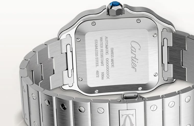 卡地亚针对现行版Santos系列提出近年崭新研发的QuickSwitch表带快拆系统这个概念,所以现在该系列表主想换表带时不用透过专人服务,只需自己按压表带背面接近表耳处的特设按把,就能轻松卸下表带,同时不论原本搭配的是金属链带或是皮革表带,都可以任意进行替换,表主只要把需替换的表带压回表耳内侧的凹槽就完成了,操作过程相当轻松写意。此外卡地亚针对链带部分也研发出所谓的SmartLink技术,这项系统是在链带接近表扣部分的錬节单侧设有一枚隐藏式按把,一旦按压按把就能可松开固定夹,所以表主如果要缩短或延长链带长度,靠自己就可以快速且轻易地完成。