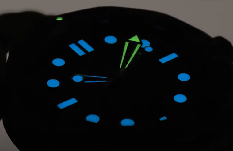 海马潜水300米将日期窗设置在6点方向,可以和12点方向的欧米茄和超霸名称互相呼应,看起来格局对称而和谐;绿水鬼乃是将日期窗放在3点方向,但因为它多了小窗凸透镜,所以视觉上的比例倒不像海马潜水300米那种刚刚好的味道。此外海马潜水300米表圈上倒三角形指标以及分针的夜光效果为绿色、时针、秒针和时标的夜光效果为蓝色,这点有助于佩戴者更清楚判读时间。