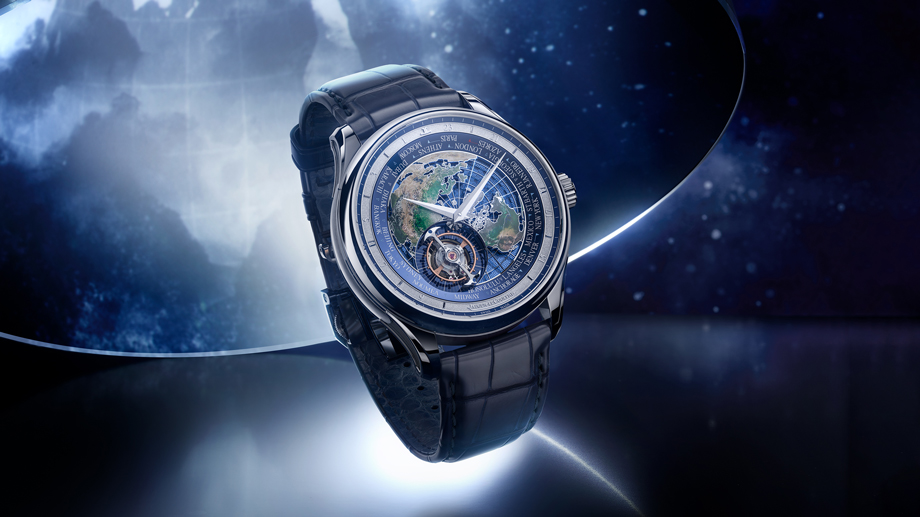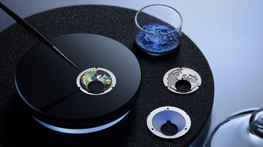 与所有经典的世界时间显示一样,此腕表围绕中央表盘的圆环上,均以一个代表城市的名称指示每个时区。城市圆环外是两个固定的同心圆环,第一个是24小时显示圆环,设有镶贴数字和长方形时标,第二个是设有激光雕刻轨道式分钟刻度环的蓝色漆面圆环,与蓝色海洋互相呼应。半球形地球地图模仿地球自转,与世界时间陀飞轮和城市圆环每24小时旋转360度,时刻准确地显示每个城市的时间。