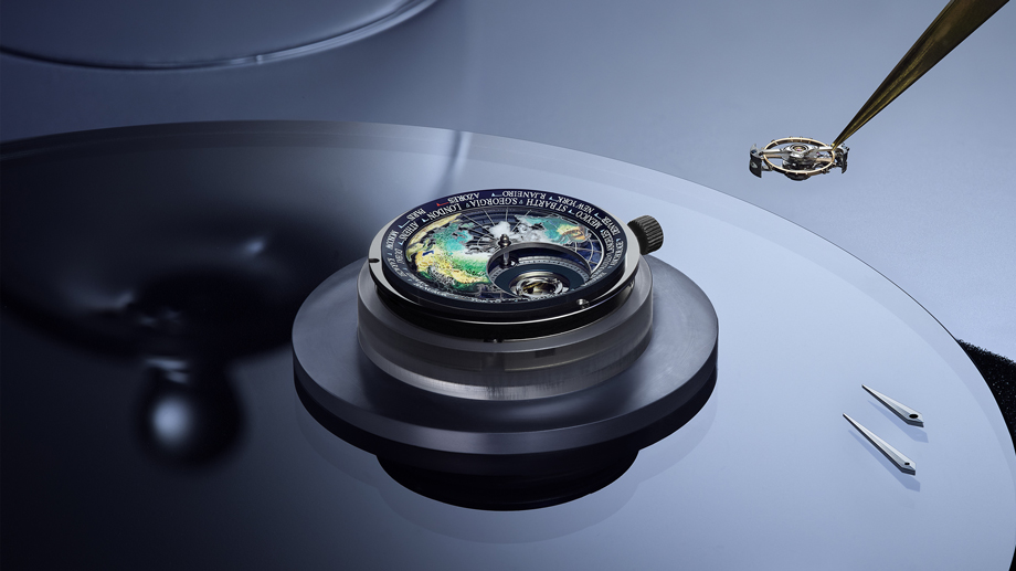 ▲世界时间陀飞轮每60秒旋转一周,每24小时于表盘上旋转一周。