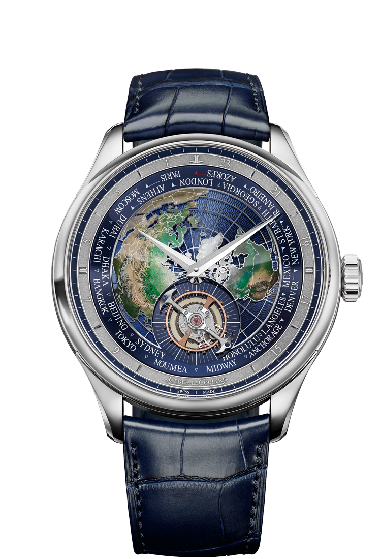 世界 表盘由多个组件组成,重叠交错而又层次分明,巧妙地突显时间测量的深度与精密复杂之特色。设计遵循世界时间功能的传统,表盘中央可见一幅以北极上空为视角的世界地图。然而,这幅地图与传统的平面图像有所不同,其悬浮于表盘底盘,置于由北半球经纬线构成的半球形框架上。这项细节由积家珍稀工艺(Métiers Rares®)工坊的手工艺大师精心制作,在一块白金薄片上勾勒出地球各大洲的轮廓线条,并饰以内填珐琅。