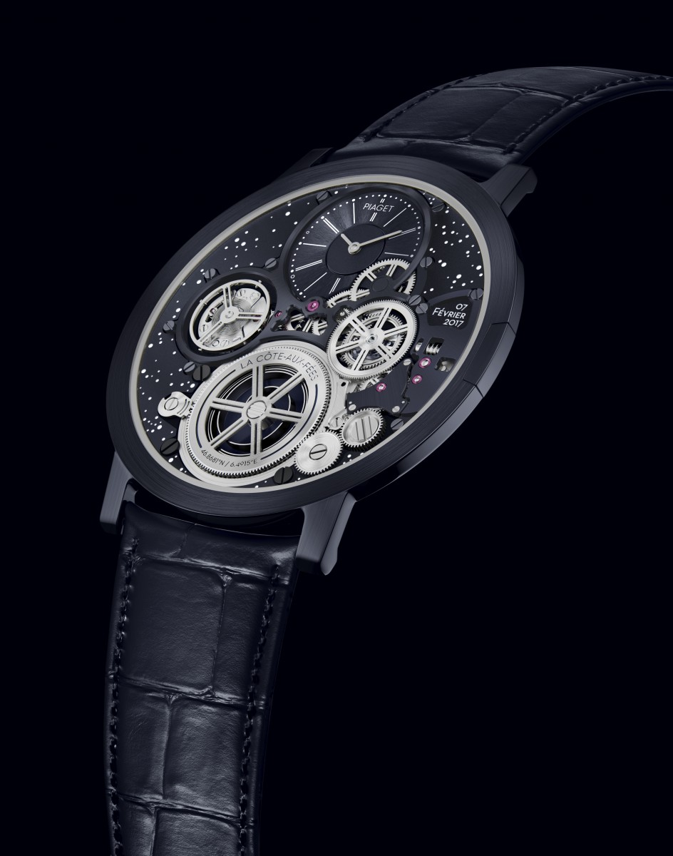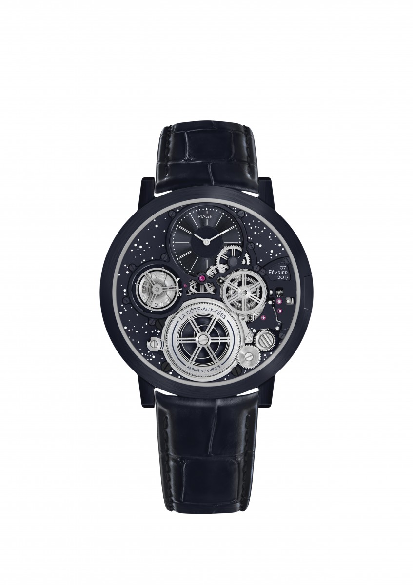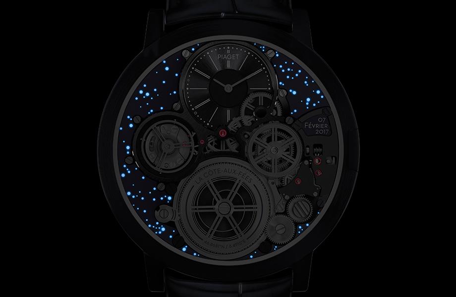 从表盘顶部开始:爵标徽标採用具有历史意义的字体来展现,此 字体与位于La Côte-aux-Fées小村庄(伯爵的诞生地且至今仍然存在)的伯爵制表厂上方徽标所使用的字体相同。位于分钟 圈圆点之间的两个放大圆圈中标志着首款AUC终极概念腕表 问世的时间 7:47。设于2:30位置的一个小视窗中印有AUC终极概念腕表的生日 2017年2月7日。此外,棘轮上还刻有「La Côte-aux-Fées」字样以及制表厂的GPS坐标。最后,表盘也加入了致敬的行列,其背景饰有覆以Super-LumiNova夜光涂层的明亮星辰,再现了AUC终极概念腕表诞生当时La Côte-aux- Fées上方的天空。