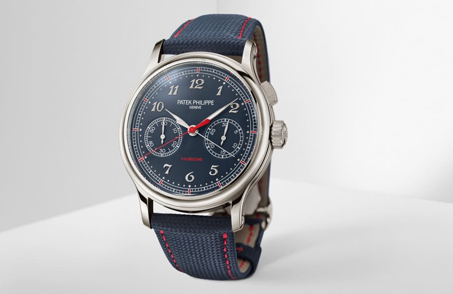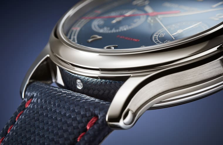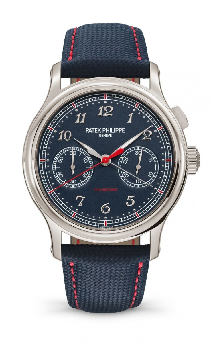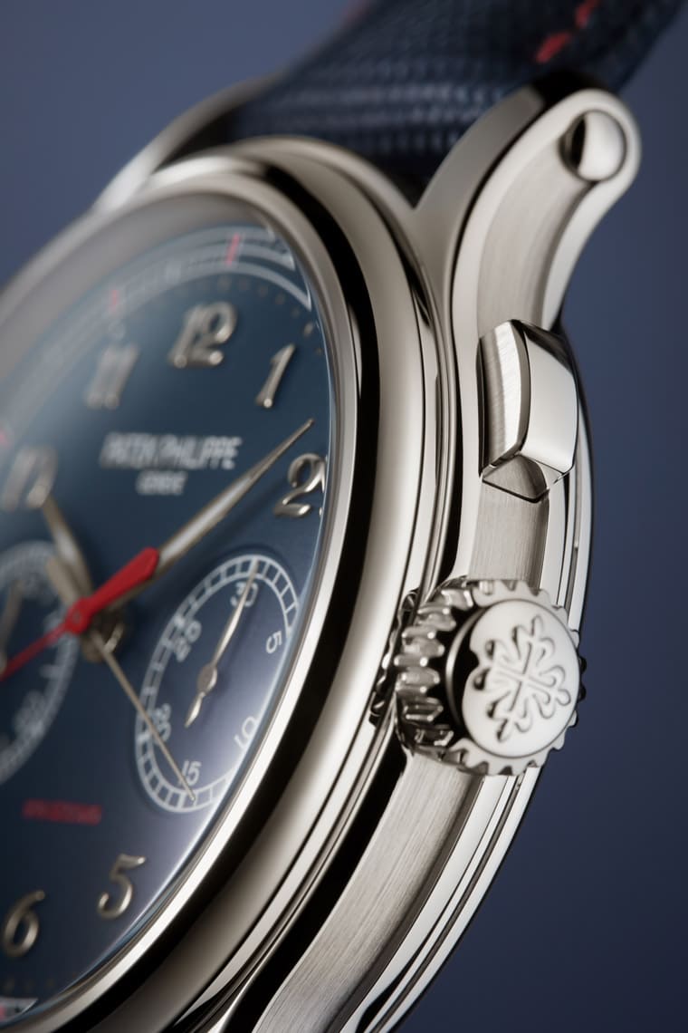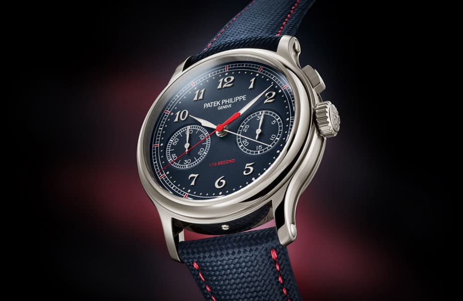 表坛上早有其他品牌开发出5赫兹高震频计时码表,不过5470P带有品牌独树一帜的风格,整体展现出的工艺细腻度依旧有令人耳目一新的水准。表款外观由铂金材质打造,搭配具有凸面织物图案的蓝色小牛皮表带以及其两侧的红色缝线,展现出Grand Complications系列比较少见的运动风格。5470P的计时功能由2点方向的单一按把操作,至于腕表蓝色漆面上的双眼计时盘格局乍看与一般计时码表无异,但仔细品味会发现手表蕴含的高规格工艺。