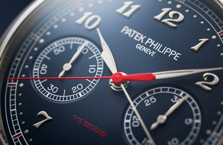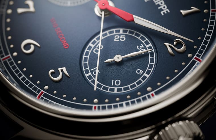 面盘6点方向红色的1/10 SECOND字样先一步说明了手表的计时功能有别于PP过往的计时作品,而再仔细看面盘外围,会注意到刻度似乎比较多,而且也不是计时码表搭配出现的测速计或测距仪等刻度,原来品牌为了清楚展示1/10计时,所以特别设置了两组计时装置——一组负责传统计秒以及30分累计测量、另一组则是用来显示1/10秒测量结果。因此面盘最外围的刻度数一数共有12等分,每等分又分成10格代表1/10秒,搭配面盘中央轴心的红色指针即可用来判读1/10秒度量结果,至于另一枚银色指针则是搭配珠粒刻度显示60秒转一圈的传统计时秒针型式。若佩戴者平常没有启动计时功能,上述的两枚计时秒针会重叠并停在12点方向,一旦透过2点方向的按把操控计时功能,它们就会以各自不同的速度开始计量,精准又炫目的指针交响曲就此在佩戴者眼前上演。