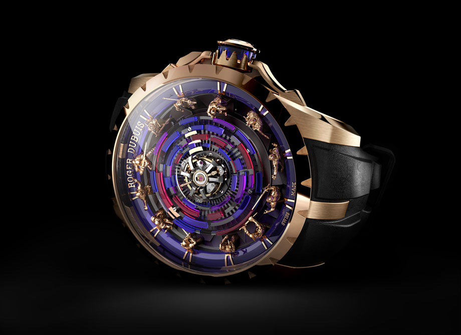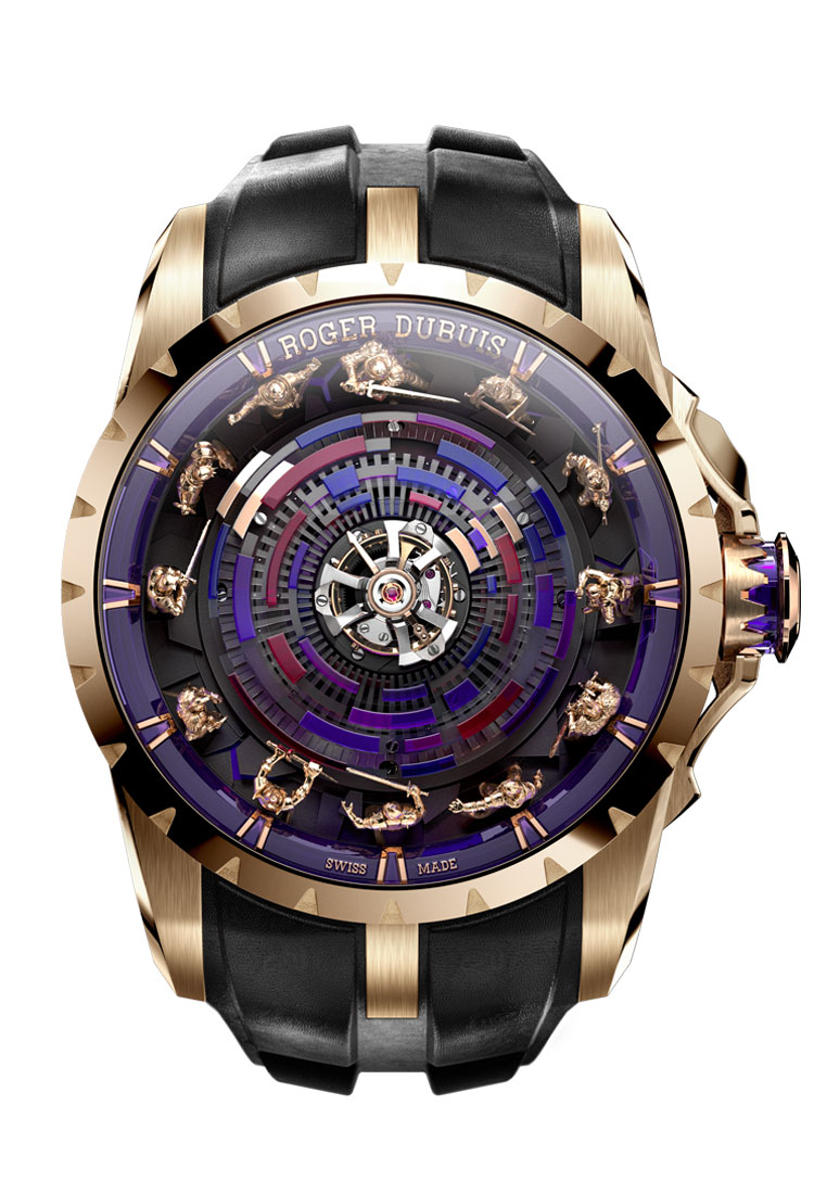 以玫瑰金铸造并独立微雕出的骑士时标仅高6毫米,得益于精湛技艺,每一位身披鎧甲,各展个性,呼应着Roger Dubuis罗杰杜彼对于当代高级制表备受肯定的投入、激情与胆识。 为了完全融入表盘的同心圆设计,此款圆桌骑士作品採用意想不到的指针设计;两个金质标记分别指示分钟与小时,于完美居中的蓝宝石水晶圆盘上旋转来表达时间。此外,表盘中心的陀飞轮周围由紫色半透明穆拉诺玻璃细块「悬浮」围绕着,腕表的双面盘缘也是由一整块穆拉诺玻璃所雕刻而成;为达至此效果,整组表盘需要进行至少八层装饰,在如此微小的表盘上创作绝非易事。 所有细节都成就着此枚超级腕表的杰出非凡。再一次确保着设计的一致性与3点钟位置骑士的完整性,腕表的功能设置桿被调整至2点钟的位置。当按下此设置功能时,红色标示旗会显示时计已由上链模式转入设定模式。