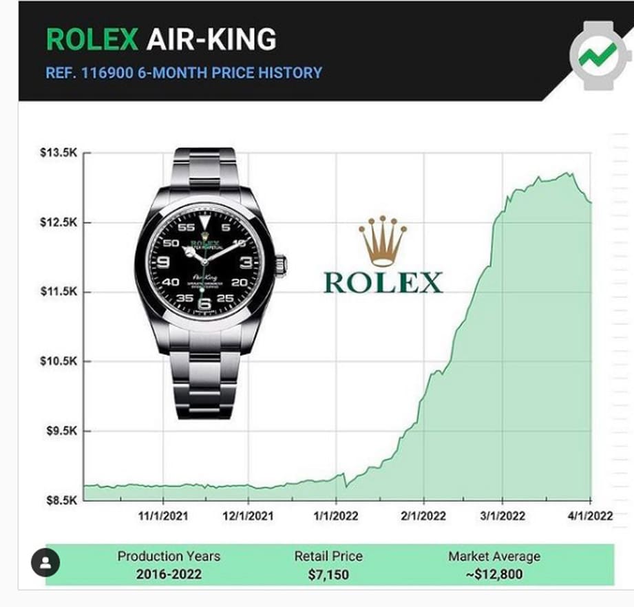 根据外媒Passion_Luxury_Watches的报导,116900在2022年年初的身价大概是8,750欧元左右,比起这款表在去年第四季约8,650欧元的身价有小涨一点,然后接下来的情况就有点疯狂了,在日内瓦钟表与奇迹表展于3月30日登场前,由于市场预期116900会停产的心理,因此手表的行情整个三级跳,在3月底时冲高到13,250欧元的巔峰境界,看起来如果劳力士真的在2022年「关闭」Air-King系列,手表的行情还真的有可能再持续升上去。