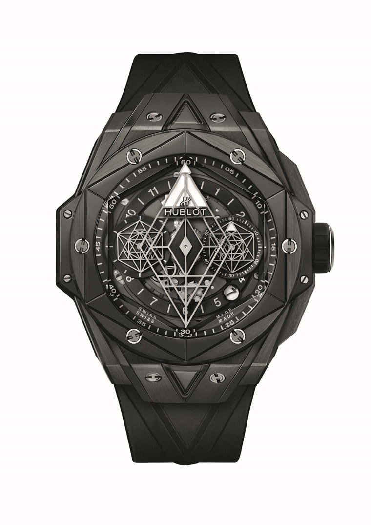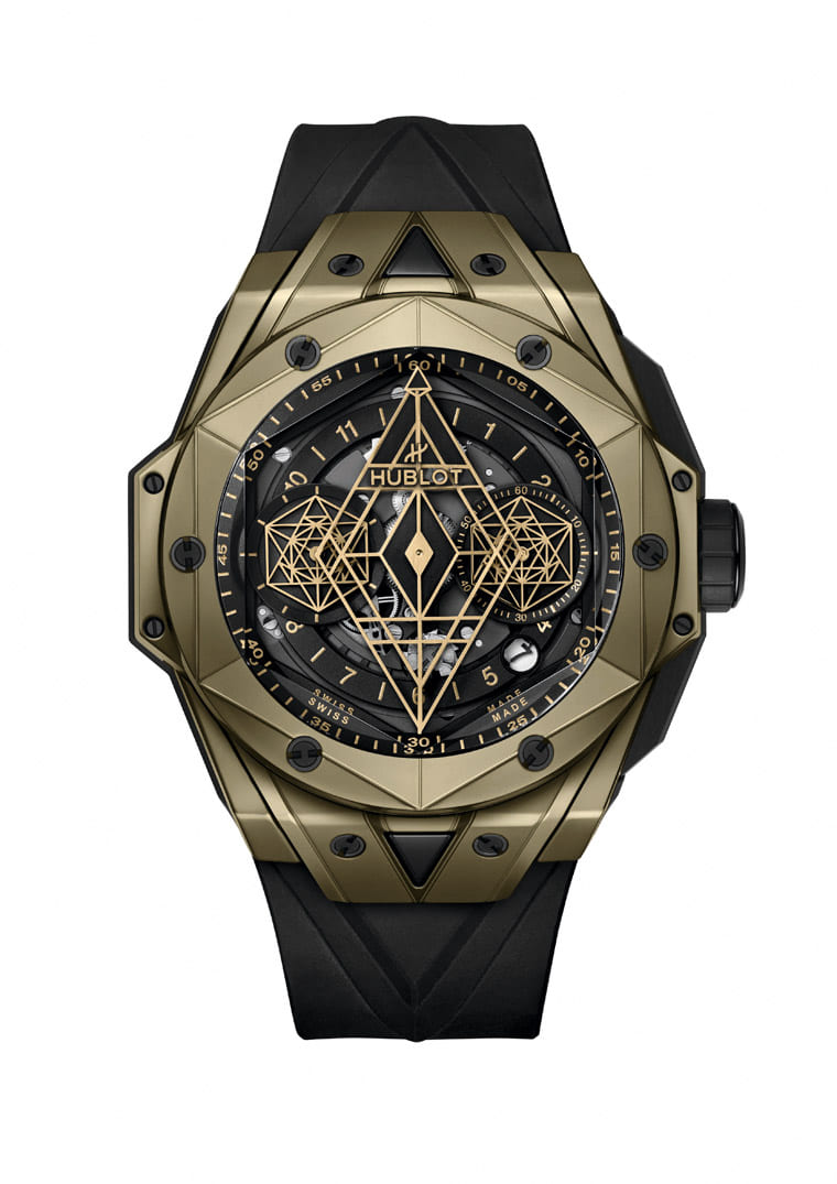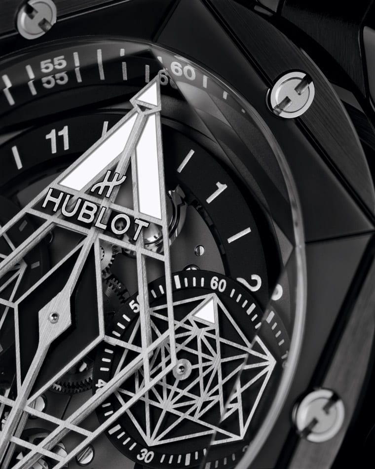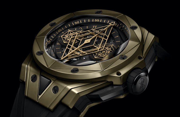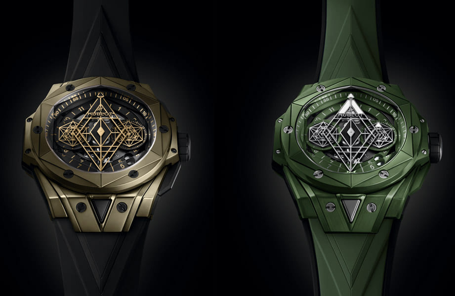 新款Big Bang Sang Bleu II计时码表分别以宇舶专利的魔力金、黑色或绿色陶瓷制作表壳,而虽然隶属于大爆炸系列,但是对于平常有在Follow品牌手表的人,应该马上就会想到手表外观独树一帜的造型。Big Bang Sang Bleu家族手表造型延伸自Sang Bleu刺青工作室擅长的几何图腾,因此这个子系列和一般大爆炸手表有个明显的不同之处在于表壳以六边形、菱形以及三角形彼此重叠交替出深邃浮雕效果,犹如帮手表进行立体感强烈的刺青般超有特色。