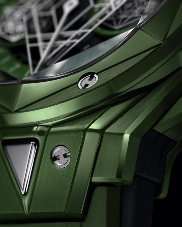 更繁复纵错的线条代表手表的制作难度也会提高,宇舶这次採用的两大类材质有个共通特点就是硬度高,包括魔力金是世上第一个具有耐磨抗刮性质的贵金属,它的维氏硬度达1,000,是一般K金的两倍以上,这种材质之所以能拥有高硬度的关键在于宇舶将24K纯金与陶瓷合而为一,所以魔力金既有贵金属的金黄光芒,同时在硬度方面也有传承自陶瓷的大幅成长。至于这几年在品牌旗下大放异彩的亮彩陶瓷,它的硬度比起一般陶瓷更高,大概是1,500维氏硬度比1,200维氏硬度,而且宇舶的陶瓷材质顏色还特别丰富,像这次Big Bang Sang Bleu II计时码表分别以黑色陶瓷和绿色陶瓷造型示人,前者属于陶瓷材质的传统配色,至于后者则是目前宇舶的独门彩色陶瓷。无论要用魔力金还是亮彩陶瓷材质制表,品牌在加工上的难度也会更高,加上Big Bang Sang Bleu子系列本身的造型也是很多层次,因此品牌要经过一连串的拋光、缎面、切割、雕刻、倒角以及刻面处理,最终才能塑造出手表外观。
