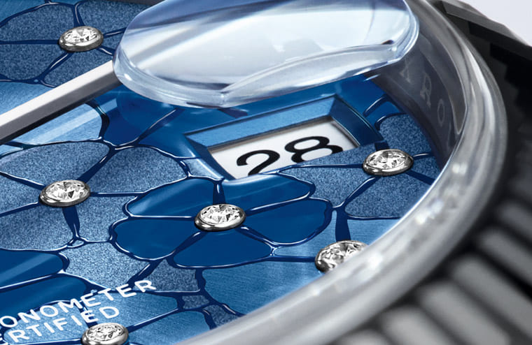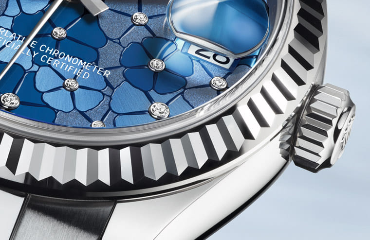 新款Datejust 31启用的面盘装饰以花朵为主题,每一枚面盘皆匯聚多达24朵花卉图案,同时品牌採用太阳光线、雾面和粒纹等三种装饰工艺分别替花卉图案装饰,塑造出同色调的多重层次感,其中白金钢的面盘为蓝色、黄金款面盘图案为橄欖绿色、永恒玫瑰金钢款的面盘图案则是银色,三款面盘虽为单色调,但是透过三种装饰工艺的演绎,让它们呈现出色泽深浅之分,间接强化了对比感,让面盘图案看起来更生动。