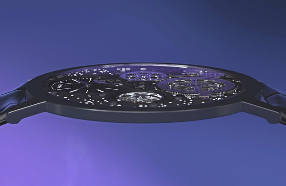2022年新出的Altiplano Ultimate Concept继续围绕与伯爵以及手表本身相关的元素进行发想,在手表中埋入许多设计彩蛋。表款以高科技鈷基合金制作表壳,其中表圈、表耳和底盖皆经过缎面拉丝处理,展示出手表整体仅2mm的究极纤薄程度。甚至手表搭配的深蓝色鱷鱼皮表带厚度也呼应超薄表壳,只做成1.5mm的厚度薄如信用卡一般。面盘可见伯爵以暗岩蓝PVD机板强化视觉效果,而虽然面盘的偏心表盘、轮系与发条等零件的格局都与前几年的Altiplano Ultimate Concept一致,可是这次伯爵新增了许多细节值得玩味。