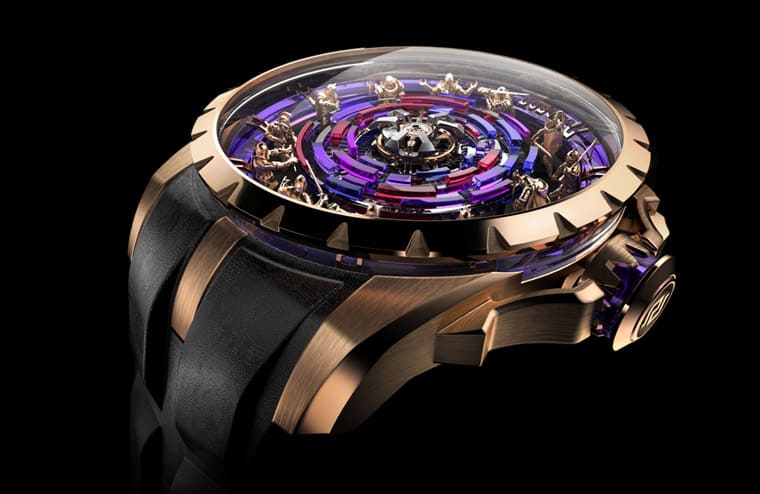 圆桌骑士单陀飞轮手表採用玫瑰金制作手表的霸气外壳,表圈上的槽纹就像是被砍击出来的英雄战斗痕跡般醒目,至于这系列的重点往往在于面盘设计源源不绝的创意,此次罗杰杜彼破天荒採用中置陀飞轮装置,刚好圆桌骑士手表面盘往往融合同心圆的概念,使陀飞轮能在面盘中央找到安心归宿。导入中置陀飞轮之后,代表我们习惯的时、分指针显时模式也会有所变化,品牌採用两枚金质指标作为时、分指针,指标上层乃是一块蓝宝石水晶圆盘,上面镶有不同色调的紫色半透明穆拉诺玻璃,顺着陀飞轮的自转特性,玻璃色块彷彿是由陀飞轮所散发出的光芒般突显了这项复杂装置的存在;另外在面盘边缘的时标环也同样是由整块穆拉诺玻璃雕刻而成。据品牌表示,圆桌骑士单陀飞轮手表的面盘至少包含八层装饰,可见其华丽视觉效果背后拟聚了品牌多少的时间与心力。除了玻璃色块与中置陀飞轮,手表不可少的元素就是微型圆桌骑士金雕了,罗杰杜彼以玫瑰金雕刻出高6mm的骑士人像,每位骑士都有各自穿戴的盔甲和专用的武器,细节中透露品牌追求完美的制表态度。