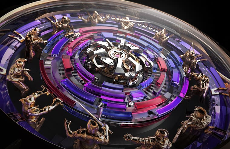 ▲中置陀飞轮、蓝宝石水晶圆盘、穆拉诺玻璃以及圆桌骑士金雕,共谱成手表迷人又炫目的阅时效果。