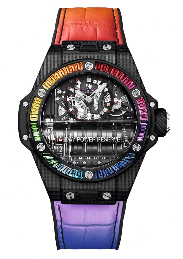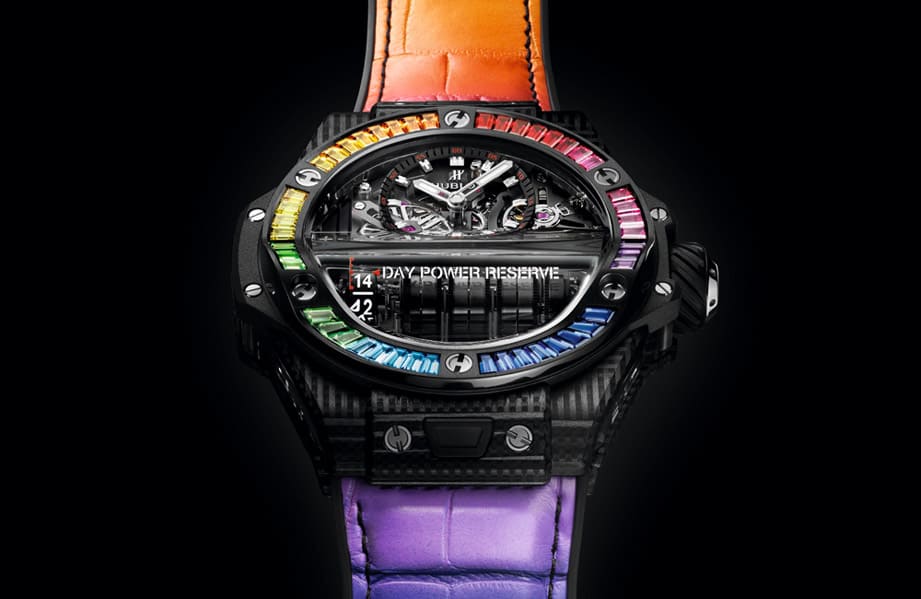 HUBLOT宇舶的Big Bang MP-11超长动能手表2022年採用高科技材质表壳,搭配吸睛又讨喜的彩虹宝石圈,于手表的佩戴感以及视觉上的惊艳度等层面,双双再进化至崭新层次。