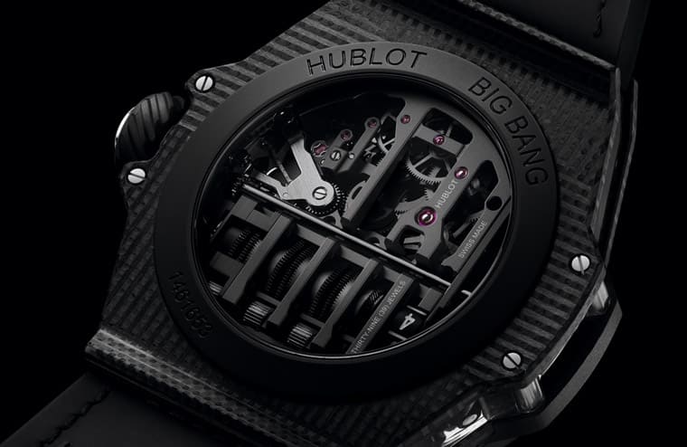 表背透明底盖周围为微喷砂镀黑钛金属,其与表壳的碳纤维材质从外观上有着明显差别,至于望进透明底盖内则能一窥HUB9011手上链机芯的样貌,这枚机芯的零件呼应表壳大范围镀上黑色,设计亮点包括硅质擒纵机制、垂直90度的螺旋式齿轮传输机制等等,零件数多达270枚,摆轮震频则是目前主流的4Hz,当然长达2周的动能也足以傲视市面上绝大多数的机械表。不过超长动能也代表上链需要花费更多力气,宇舶为此早有准备,Big Bang MP-11除了可以用传统方式徒手慢慢上链,也能藉由品牌随表附上的电动Torx触针更快速便利地完成上链动作,从表冠带有特殊造型的设计可见品牌设计上的巧思。