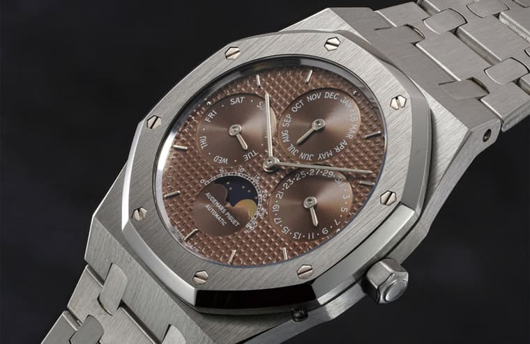 再来就是The Royal Oak 50th拍卖会最受瞩目的两只表了,分别是由英国着名零售商Asprey售出的25654PT铂金万年历,这款表为1988年制作,採用棕色面盘,此型号中的铂金款当年只限量打造38只,这次拍卖会现身的是其中编号1号的作品,以上这些原因均造就这款表成为收藏家眼中势在必得的主要目标,因此它的成交金额轻松登上了同型号目前最贵身价的纪录。