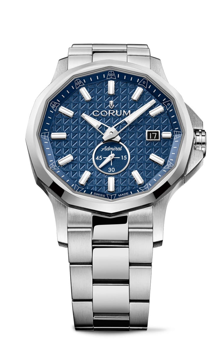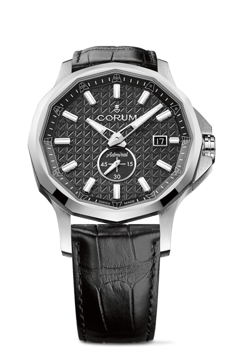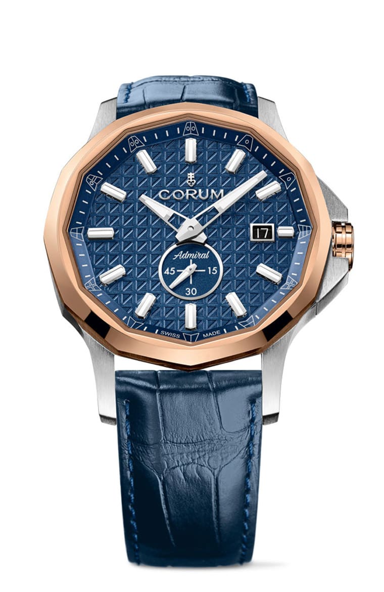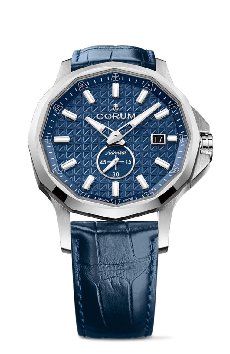 CORUM昆仑表招牌系列Admiral海军上将2022年新推出表径42mm的小三针自动表,持续以别具辨识度的造型,藉由不同材质、配色和表带等,诠释手表来自帆船运动的设计渊源。
