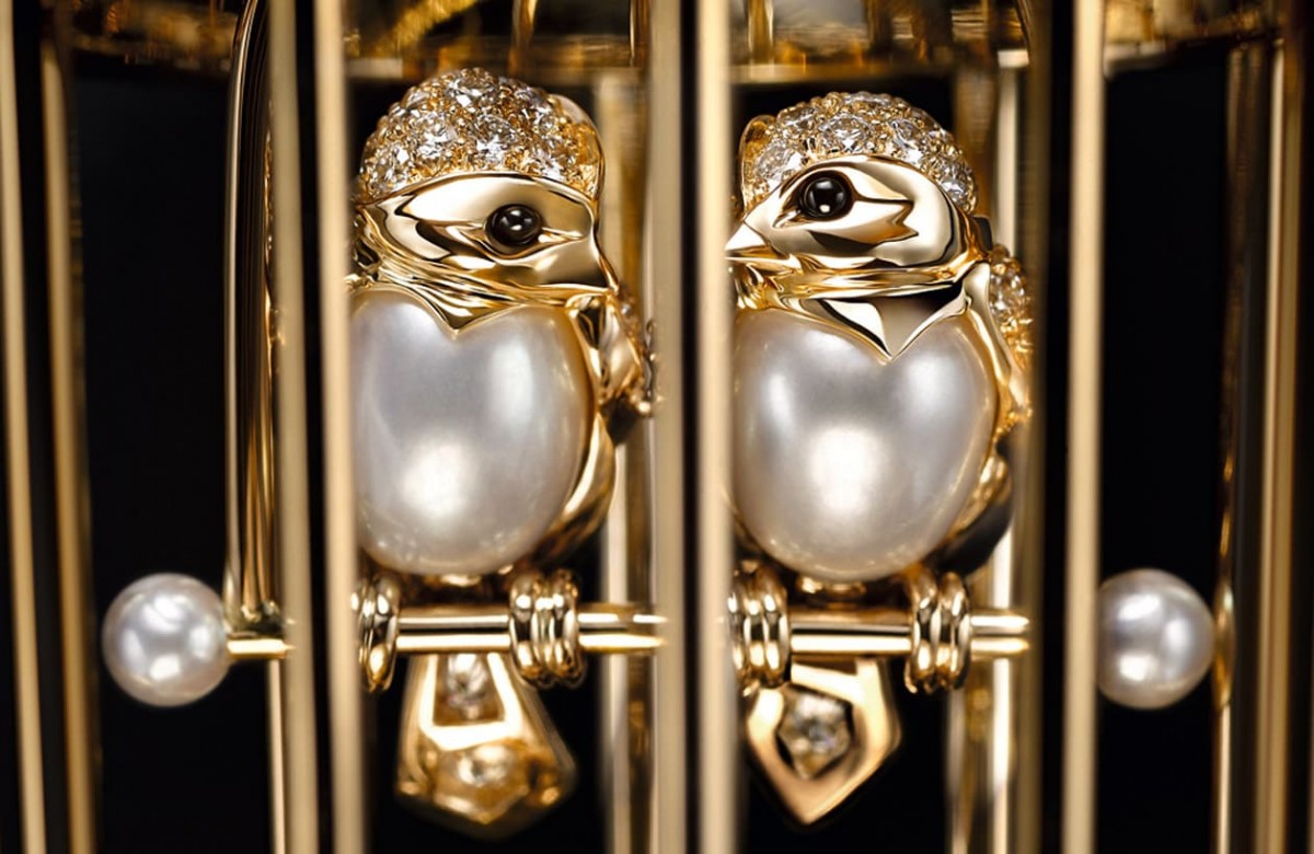 18K黄金材质/石英机芯/时、分显示/表壳与鸟笼坠饰镶钻483颗,约重11.76克拉、雀鸟镶珍珠2颗/限量1件/参考价:NT$ 15,975,000