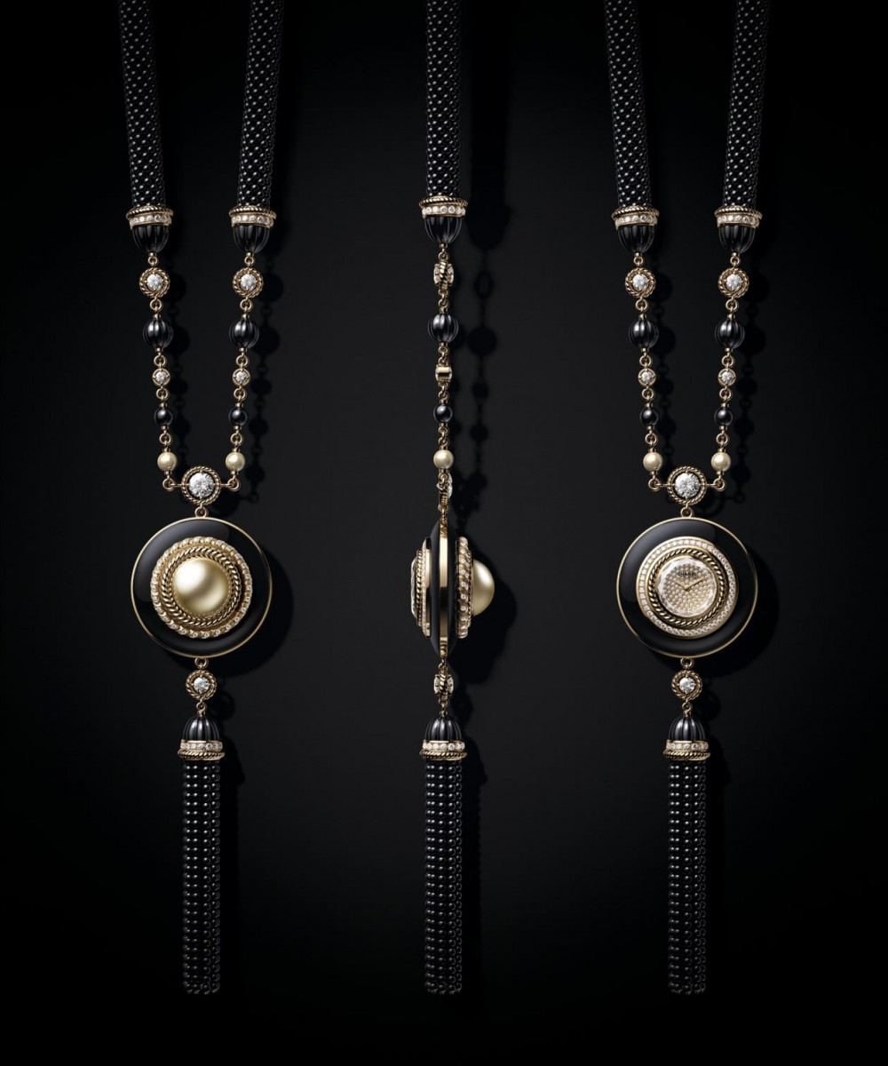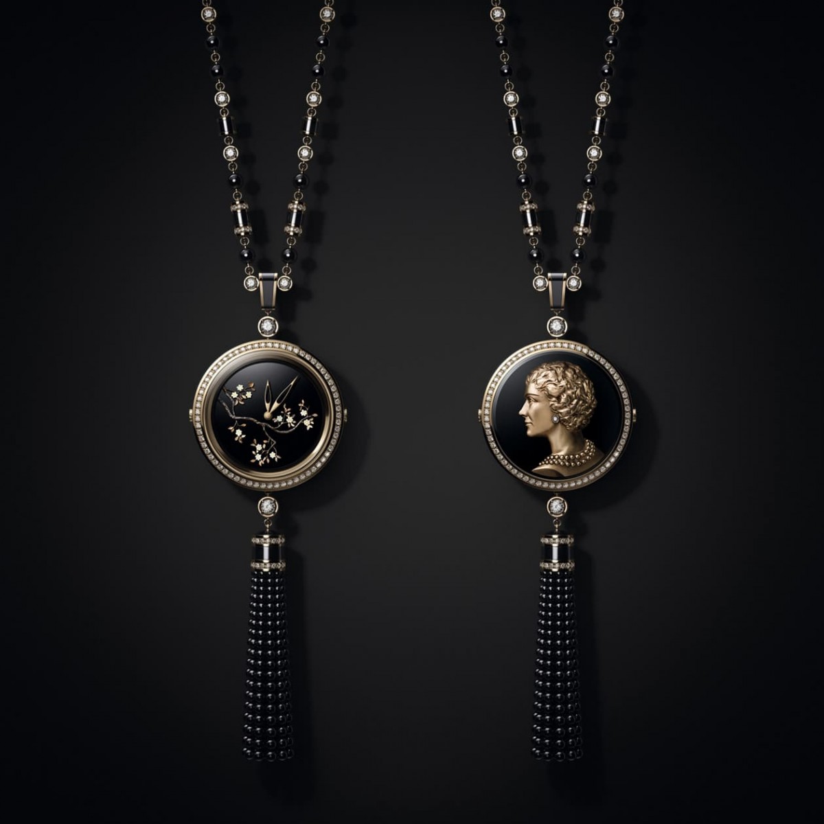 Mademoiselle Privé系列2022年还有两款全球仅制作一件的长项链表作品,其一的灵感源自于香奈儿女士私人寓所裡的一款中式「乌木屏风」,项链的精华在于位处中央的时计部分,与金色珍珠长项链表一样同为双面设计,其中一面为18K Beige米色金香奈儿女士侧面轮廓精雕,另一面则是採用米色金制作樱花树枝、珍珠母贝制作花朵,透过异材质勾勒出乌木屏风上的一景。