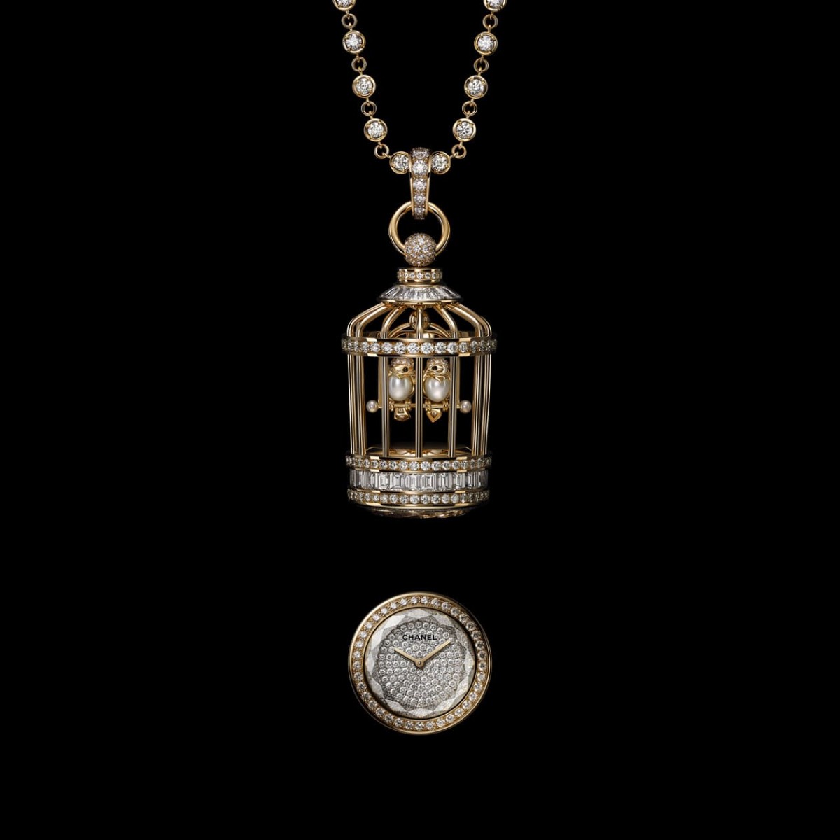 Mademoiselle Privé系列另一款仅此一件的长项链表「鸟笼」主题,设计灵感也是源自于香奈儿女士私人寓所中一款巴洛克风格的鸟笼摆饰,制作过程中最大挑战是要将鸟笼与笼中一对灵动的雀鸟微缩成项链坠饰般的尺寸,而且组装起来之后看不见任何一颗螺丝。为了克服这个挑战,品牌先用一对爱情鸟彼此相依互看的动态形体来做描绘,再特别为它们找到两颗形状与比例接近的椭圆形珍珠制作鸟身,才诞生了这对精致可爱的笼中鸟。其次,不仅所有组装零件都隐藏起来,乍看之下连钟表的表面都神秘,原来,翻转到鸟笼底部即可窥见镶满钻石的面盘,以及其上的两枚小巧金质指针。只能说,香奈儿对于主题物件炉火纯青的精彩刻画,完全展示出品牌在融合钟表及高级珠宝的高度创意与深厚工艺。