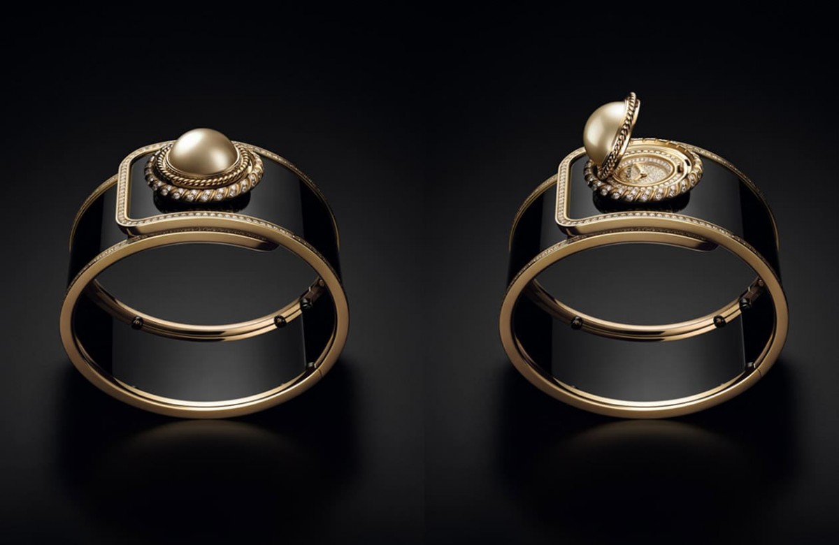 2022年的Mademoiselle Privé系列已经发展至第三代作品,此次品牌别出心裁于系列中推出以「金色珍珠」为主题的三款珠宝成套作品,包括一款銬式手鐲钮扣表、戒指钮扣表和长项链表,每款作品都各限量5只。在环绕「金色珍珠」为核心装饰的主题中,銬式钮扣表採用的手鐲材质虽是18K黄金,但是香奈儿特别将其外观镀上黑色营造近似皮革的效果,而手鐲两侧则是以原金属镶上钻石为饰边,展现与镀黑处有别的质感;品牌大胆运用工艺技术将金色珍珠切割为半作为表盖,掀开后映入眼帘的是一枚镶满钻石的小型时、分显示盘,这种在高级珠宝中含有钟表时计的设计完全实现了香奈儿女士喜欢巧妙改变物件原有功能,转化为珍奇创作的理念。