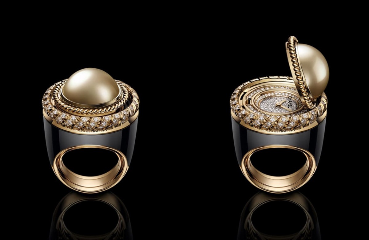 而在钮扣戒指表部分,其外观以黄金和钛材质制成,其中钛材质外观同样以黑色涂层包覆,而戒指的顶部也饰以一颗金色珍珠作为联系戒指与时计两种身份的关键元素。从戒指表外观极细腻的作工,可以感受到香奈儿完美揉合了制作珠宝与时计的长才,一方面具有显时的实用性,同时也能与珠宝饰品的精雕细琢完美呼应。