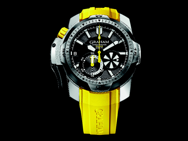 清澈、 无色、 无嗅,水覆盖了地球 70%和是所有生物所必须的。GRAHAM表致力创造既尊重大自然和未知领土的鐘表,同时让用户们体验GRAHAM表大胆创造的精彩世界。配备等温潜水氯丁橡胶服和手套,确保一个安排简单和成功的潜水行动。Chronofighter Prodive是GRAHAM表成功研发的全新潜水时计,为神秘的深海世界带来生命和光,让你能完美地成为两栖类。黄色的Chronofighter Prodive从水下发光,在潜水冒险时保证能为您找到方向。GRAHAM表着名的专利杠桿机制,无疑是啟动计时机制万无一失的最佳系统,置于表壳左侧的的位置,经反覆考虑后,触发器成为唯一控制计时码表啟动/停止和重置的推桿。好让潜水员在配戴了厚氯丁胶手套下都能轻易激活功能。单向旋转表圈装饰以特殊的模式,可确保除了 120 位置的燕尾形轮外更好的抓握。橡胶表带折叠式带扣极具潜水员风范,将成为您潜水装的一部分。