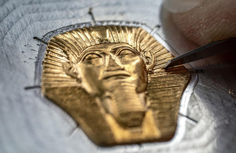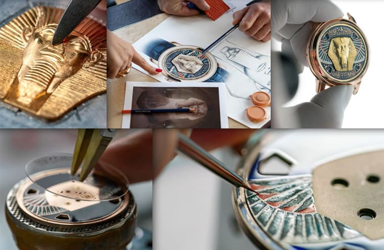 涂绘于大祭司Nakht-khonsou-irou木乃伊盒上的项链图饰,是面盘装饰元素的灵感来源。品牌工艺师在处理狮身人面像头部的黄金镶贴时,除了要在为小空间刻出人像的面部图案,就连下頜鬍鬚部分也必须讲究地课画到位。虽然制作金雕的基板相当纤薄,工艺师依然艺高人胆但地运用凸花雕刻进行浮雕创作,金雕表面在经銼削、喷砂和拋光后,工艺师会继续进行喷烧和手工上色,以突显其深邃之感。金雕外的面盘以内填珐琅工艺再现项链下方饰有一只猎鹰的羽翼图案。最后一个亮点是蓝宝石水晶膜上以金属喷镀工艺雕刻的象形文字铭文,来自塔尼斯的狮身人面像上所盖印的王名环,内容提到「上下埃及之王,两地之主,拉神之选中者,拉美西斯二世之子,玛特之追随者,赐你永生。」整体演绎出古埃及法老的尊贵和威严。