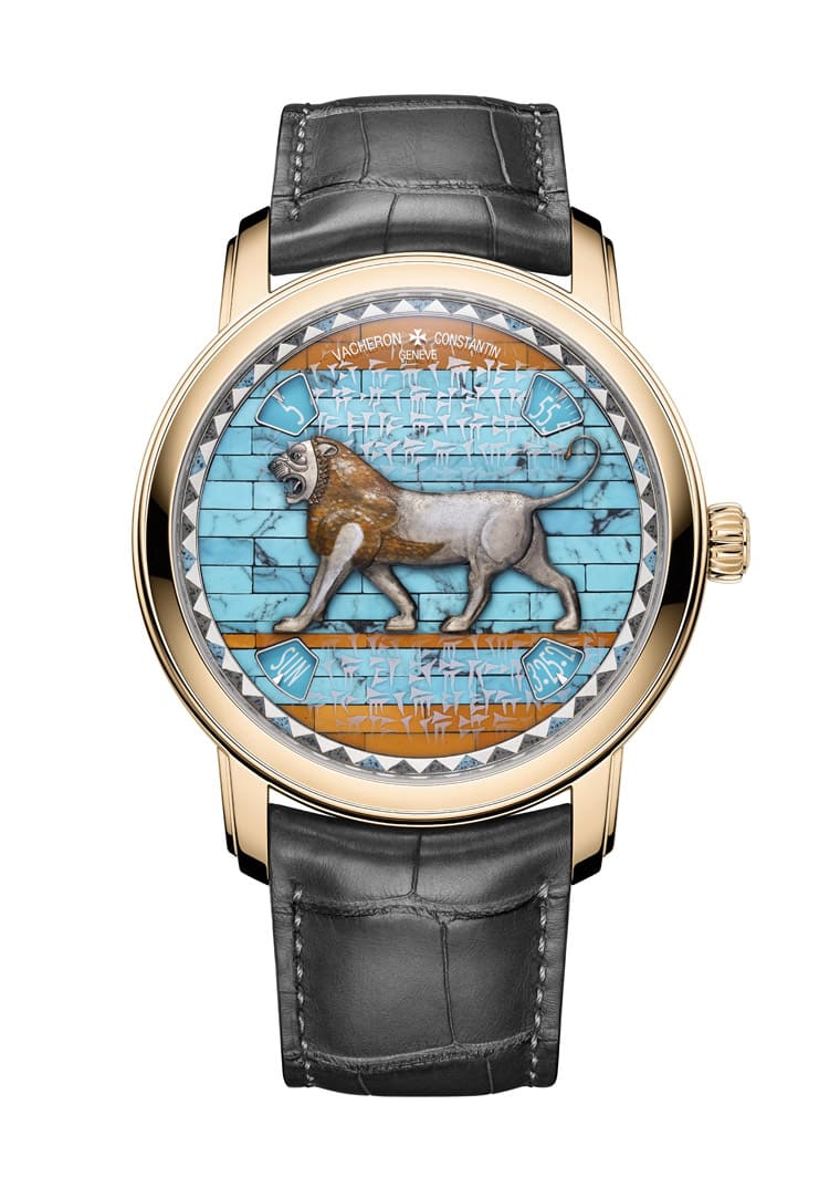 雄狮浮雕簷壁是在苏撒宫殿遗址出土现场发现的装饰元素之一,狮子是波斯帝国宫殿形象的重要标识,同时在更早时期,也常见于亚述帝国和巴比伦王国的宫殿建筑之中,因此罗浮宫便用雄狮浮雕簷壁象徵此一时期的王权。面盘上的雄狮浮雕以硅质釉面砖与石灰砂浆混合制成。面盘背景装饰元素旨在还原出宫墙上的釉面砖质感,品牌工艺师据说共採购了三次石材,最终获得69块外观和尺寸各异的镶嵌素材,它们分别是绿松石和黄色血斑碧玉。面盘外缘的装饰图案取自大流士宫殿内的弓箭手浮雕簷壁(The Frieze of Archers),这些紧密相衔的三角形装饰图案採用鐫刻金属和内填珐琅制成。至于蓝宝石水晶膜上的楔形文字摘录自古波斯语铭文,收录大流士登基后最早记录的名言之一。