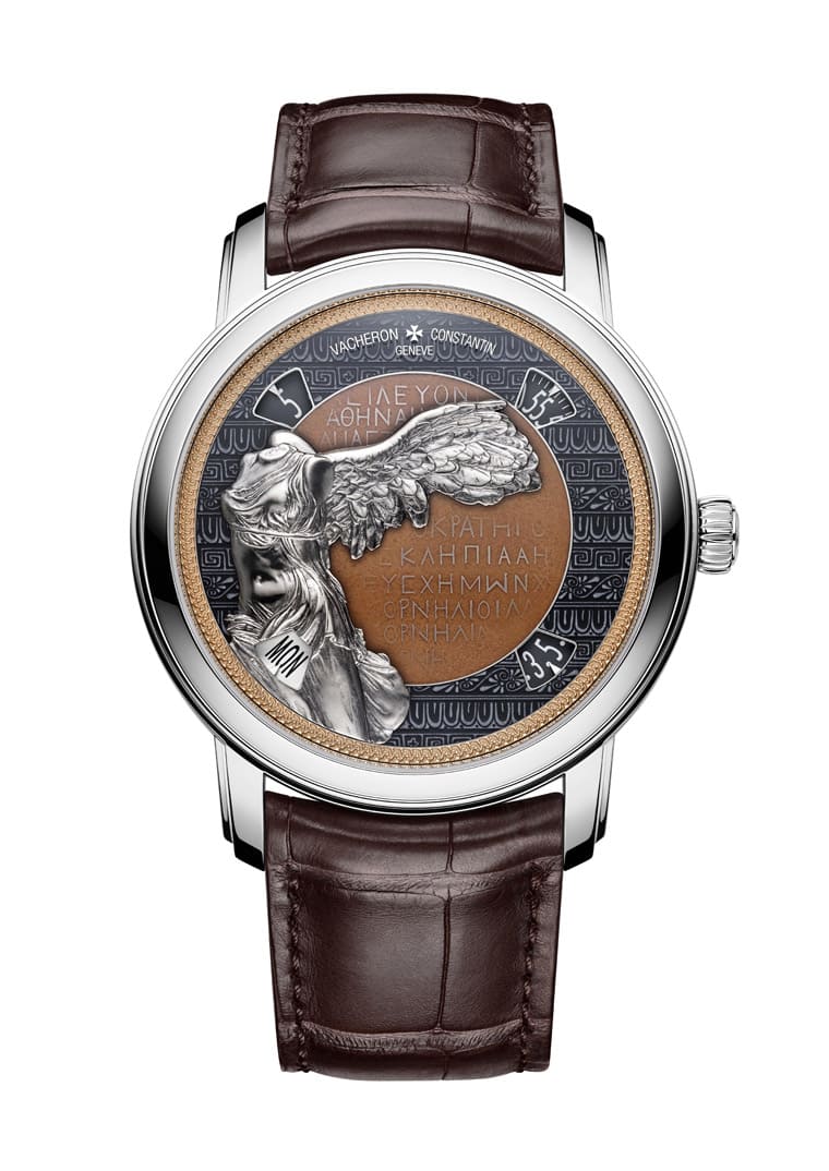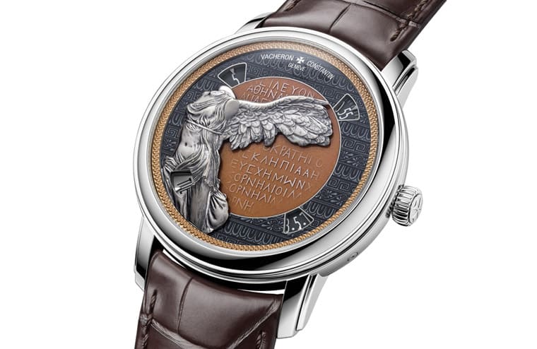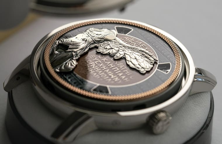 接着看到的面盘金雕大家应该多少都有印象,这尊萨莫色雷斯的胜利女神像是希腊化文明时代雕像传统中评价极高的一件艺术杰作,虽然雕塑家不详,但是他的雕刻技艺相当高水准,这件作品被视为萨摩色雷斯岛圣殿中供奉的一众贡品之一,代表了西元前二世纪雕塑艺术蓬勃发展的黄金年代。手表除了面盘的胜利女神金雕,面盘的背景棕色为珐琅材质,由于这种顏色的珐琅现在使用率极低,江诗丹顿在制作过程中共烧制6次才达到最终效果,而面盘第二圈的装饰採用灰阶珐琅工艺,图案原型取自古希腊陶瓷花瓶。至于面盘最外圈的装饰採用线雕工艺制成,图案繆思取自西元前一世纪的帕加马花瓶。如同前两款作品,这只表蓝宝石水晶膜上雕刻的古希腊文字取自萨莫色雷斯神庙发掘出的一块西元二世纪石碑上的铭文。